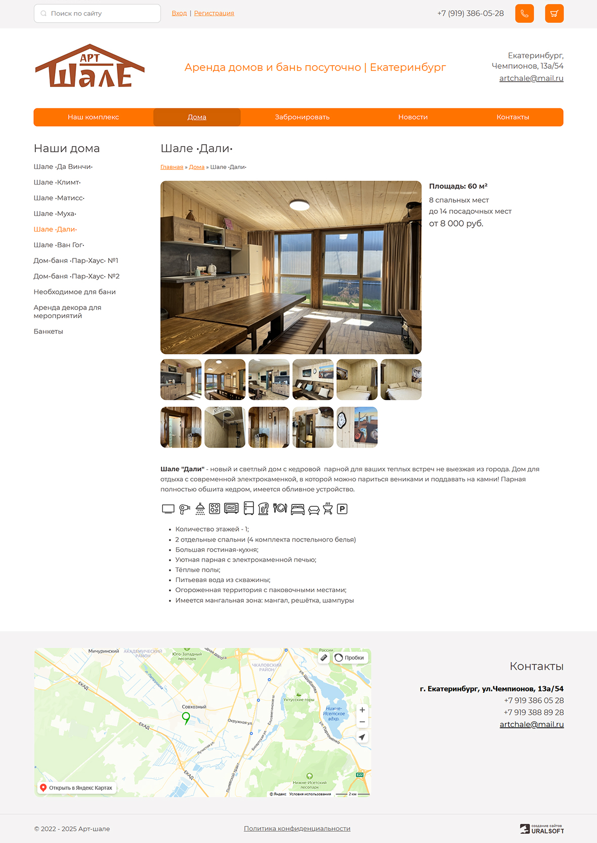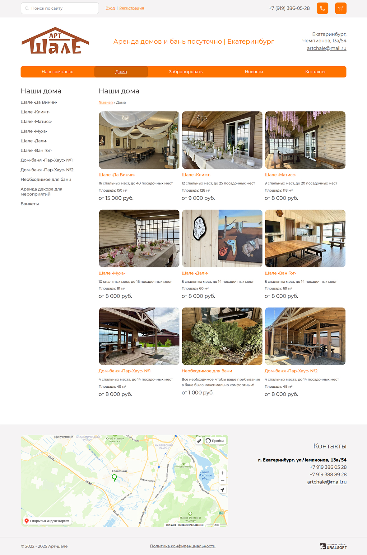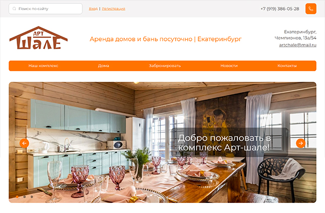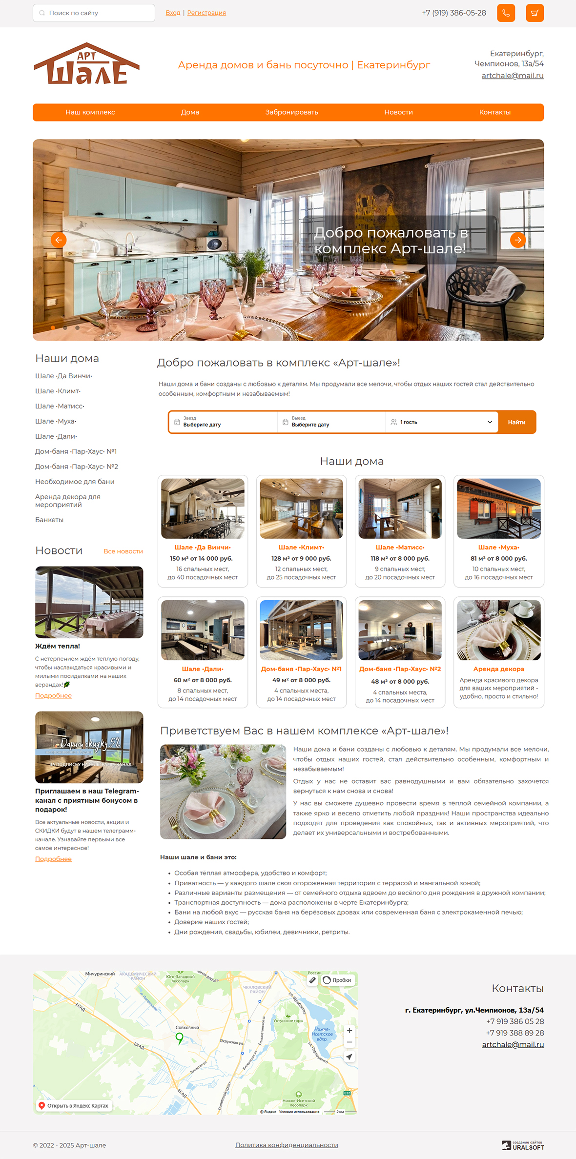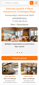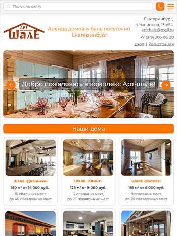 На главной странице — каталог уютных домов для аренды с возможностью онлайн-бронирования, а также вся необходимая информация для связи.
