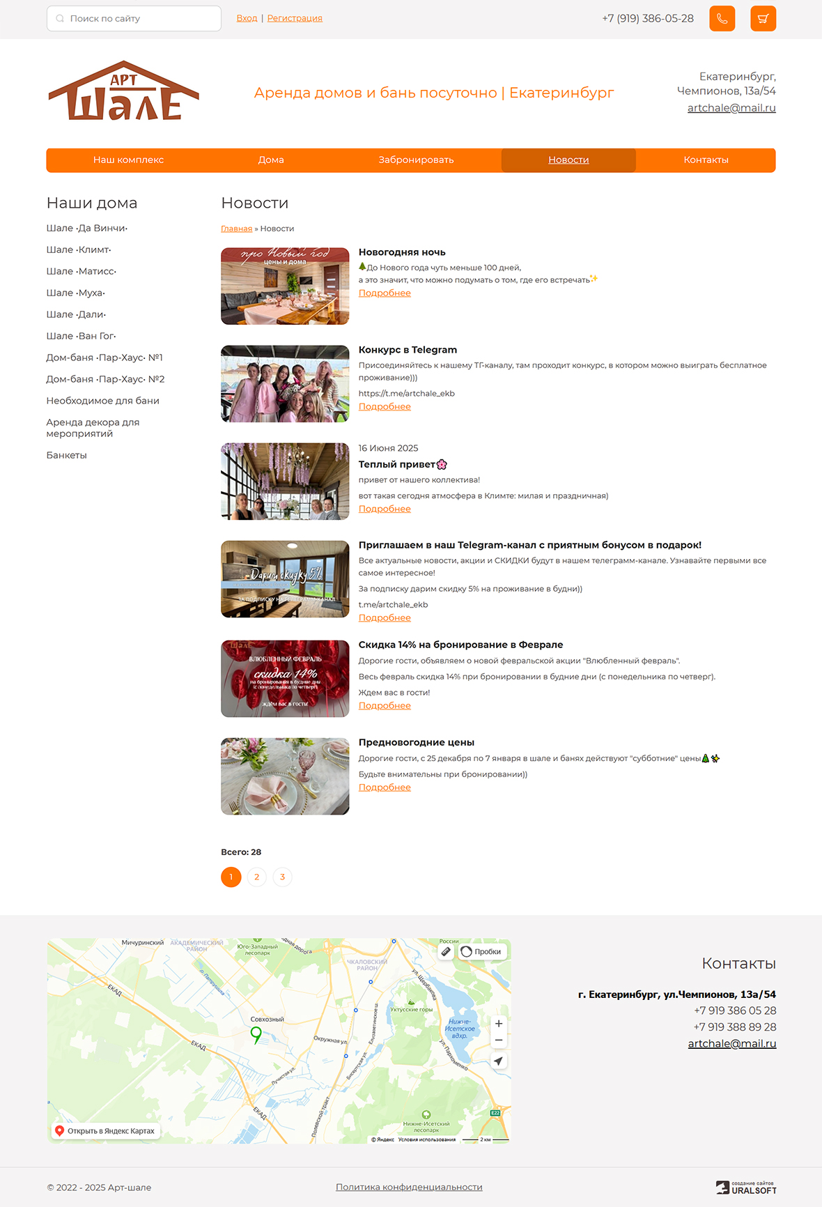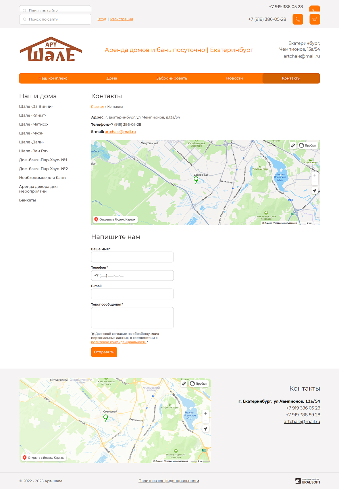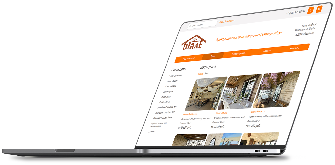 На главной странице — каталог уютных домов для аренды с возможностью онлайн-бронирования, а также вся необходимая информация для связи.