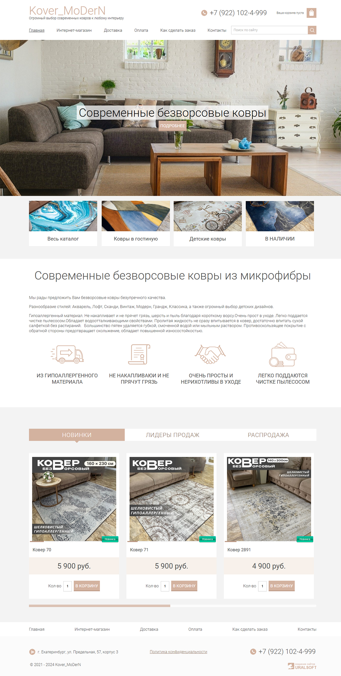 Главная страница сайта раскрывает информацию о компании и её товарах, так же тут можно найти актуальные новинки и