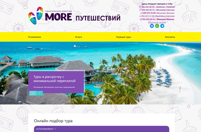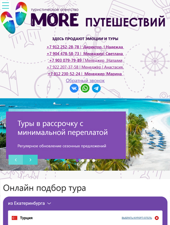 На главной странице расположены информативный слайдер, онлайн подбор тура, отзывы, статьи а так же форма обратной связи