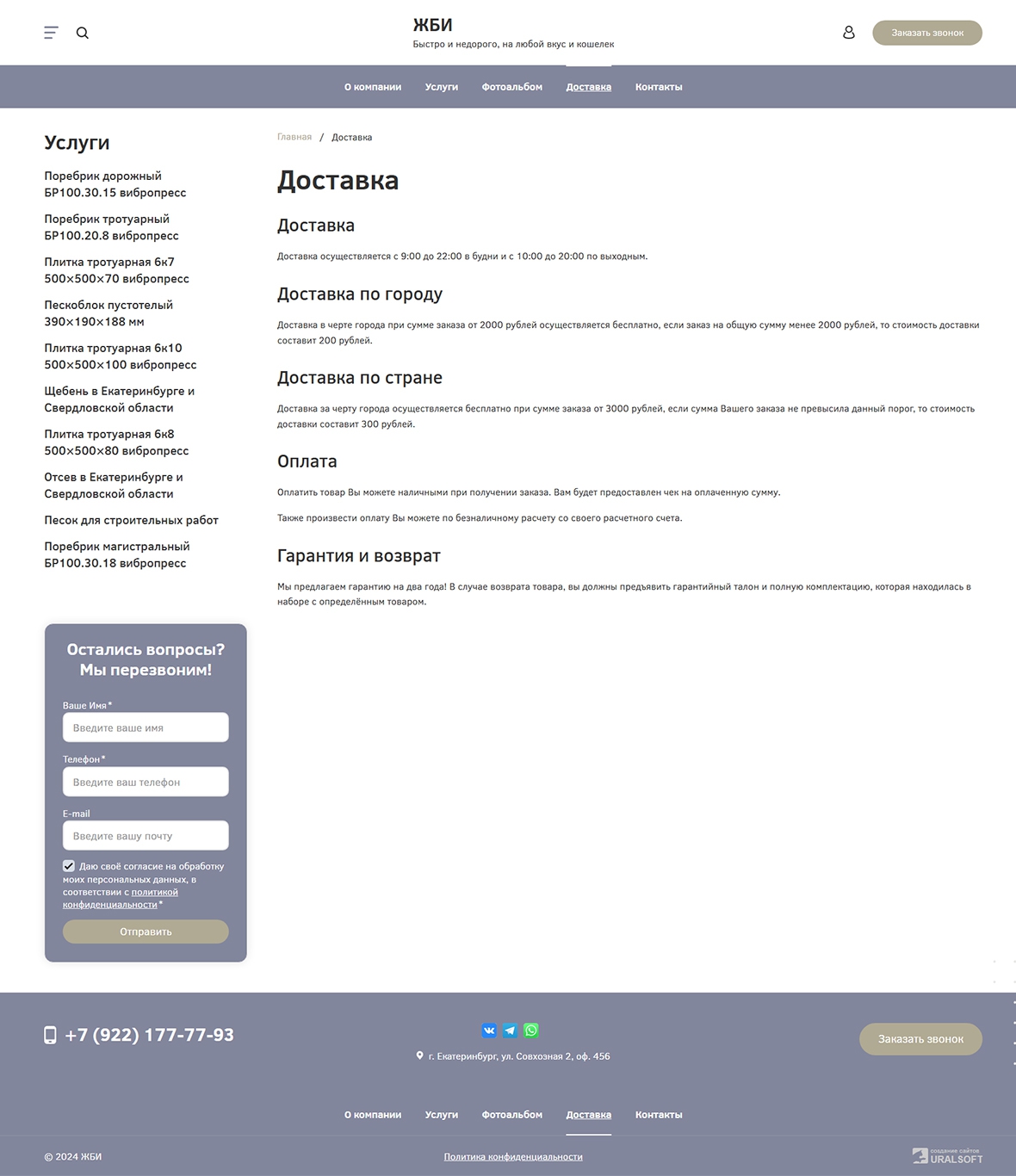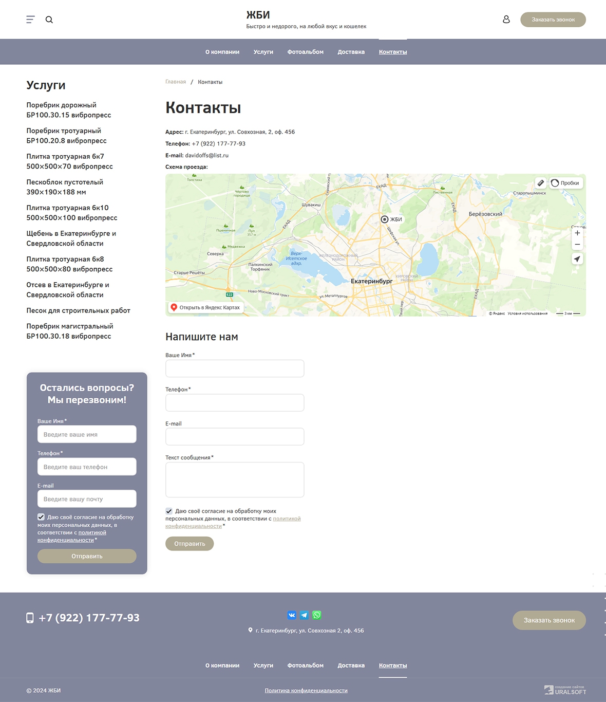 На главной странице размещены информационный слайдер, форма обратной связи и информация о компании.